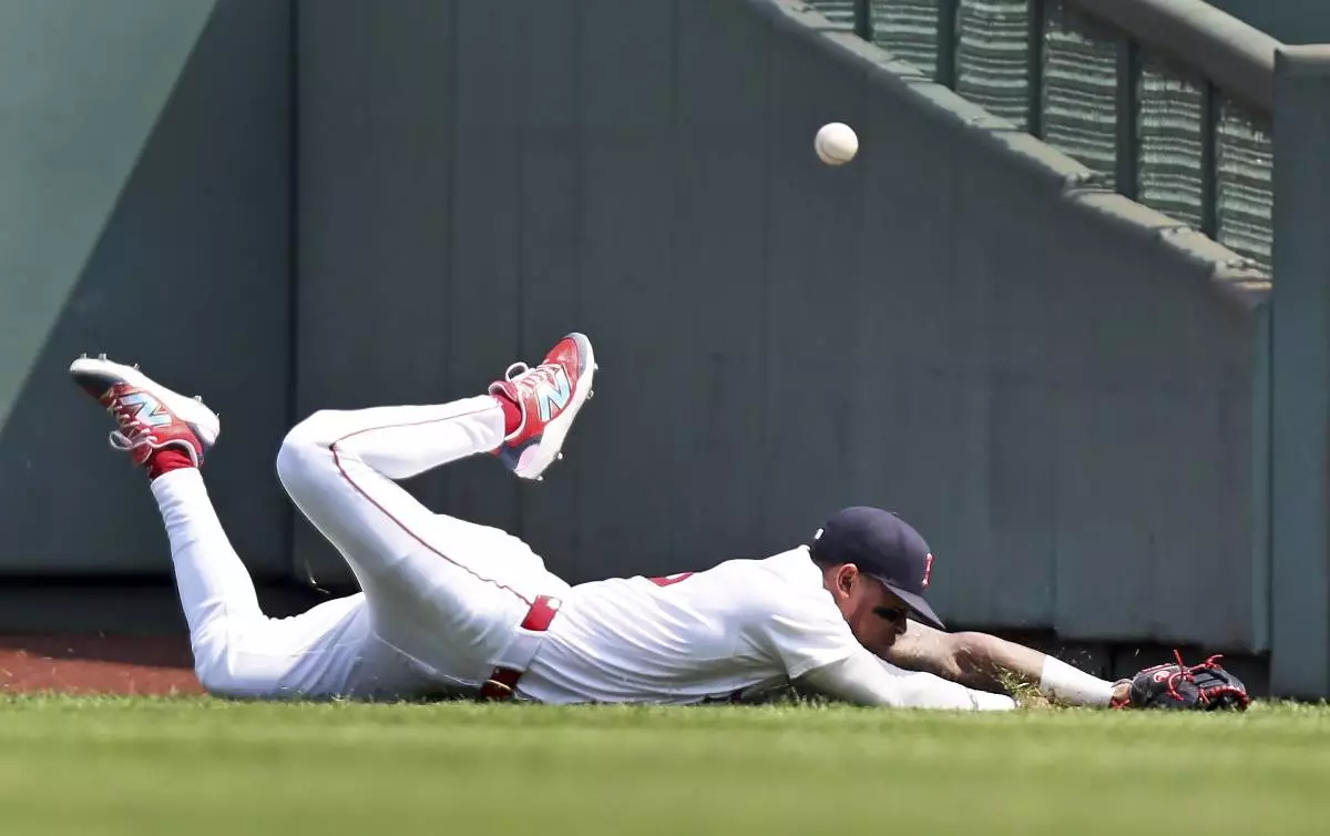 Boston Red Sox centerfielder Ceddanne Rafaela can't make the catch on a first inning double hit by the Houston Astros' Jesus Sanchez during a baseball game, Sunday, Aug. 3, 2025, in Boston. (AP Photo/Jim Davis)