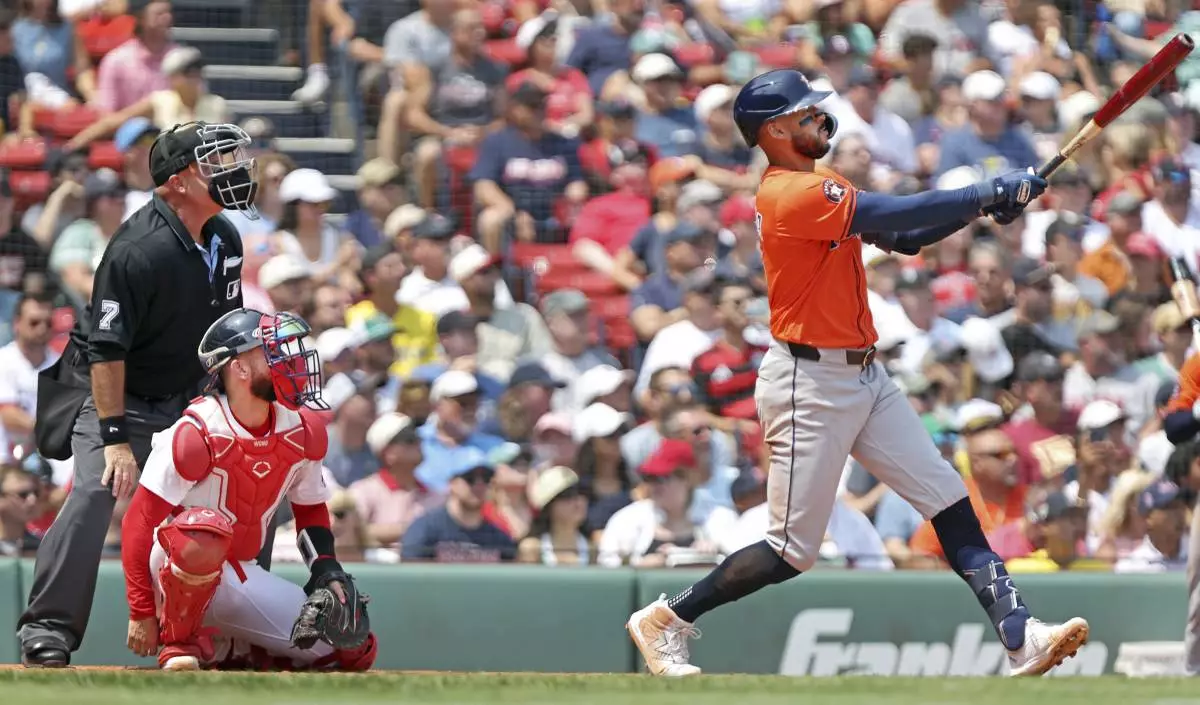Houston Astros batter Carlos Correa hits a home run in the fourth inning of a baseball game against the Boston Red Sox, Sunday, Aug. 3, 2025, in Boston (AP Photo/Jim Davis)