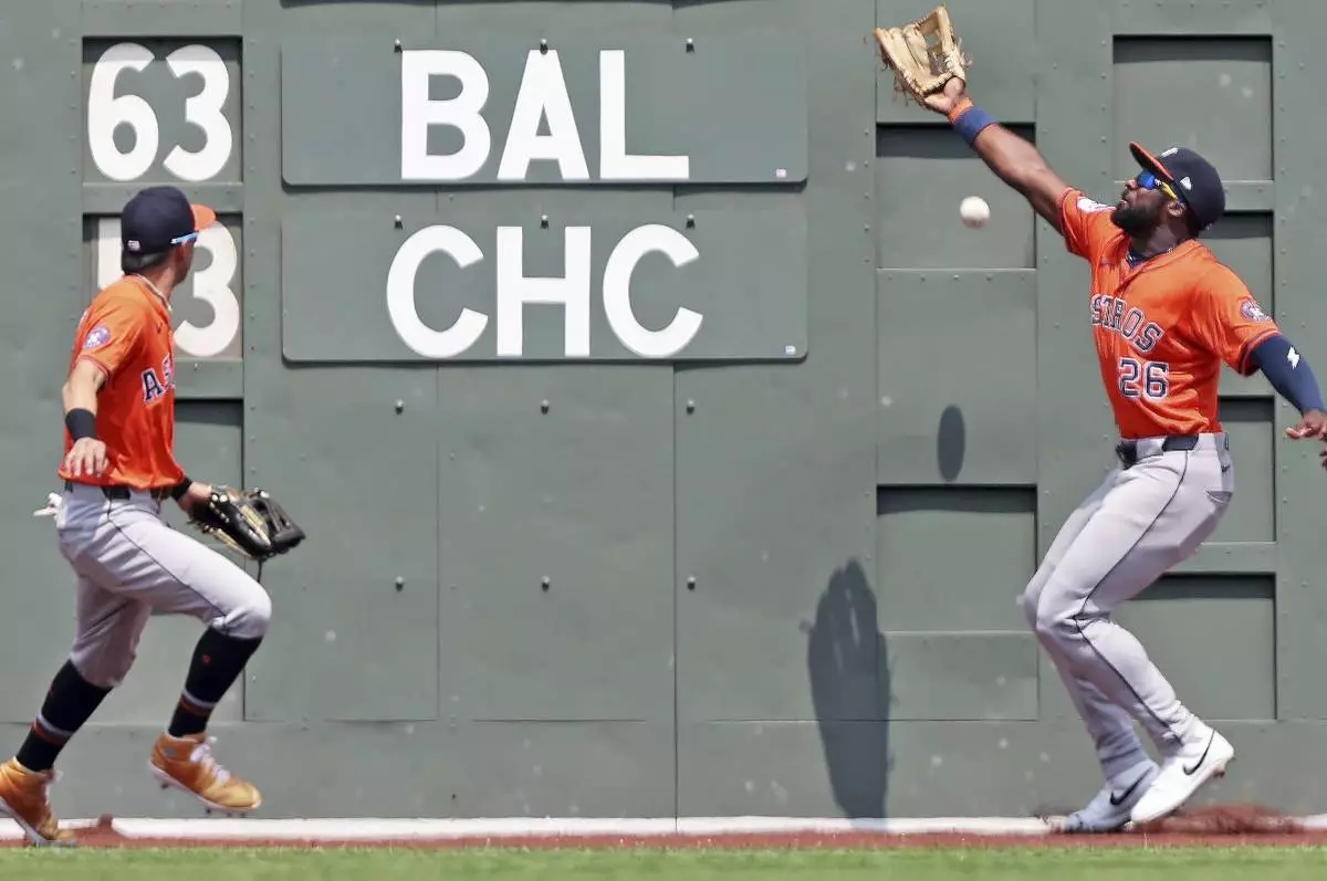 Houston Astros center fielder Taylor Trammell, right, can't make the catch on a fourth inning double hit by Boston Red Sox's Roman Anthony, not pictured, during a baseball game, Sunday, Aug. 3, 2025, in Boston. Astros left fielder Mauricio Dubonn is at left. (AP Photo/Jim Davis)