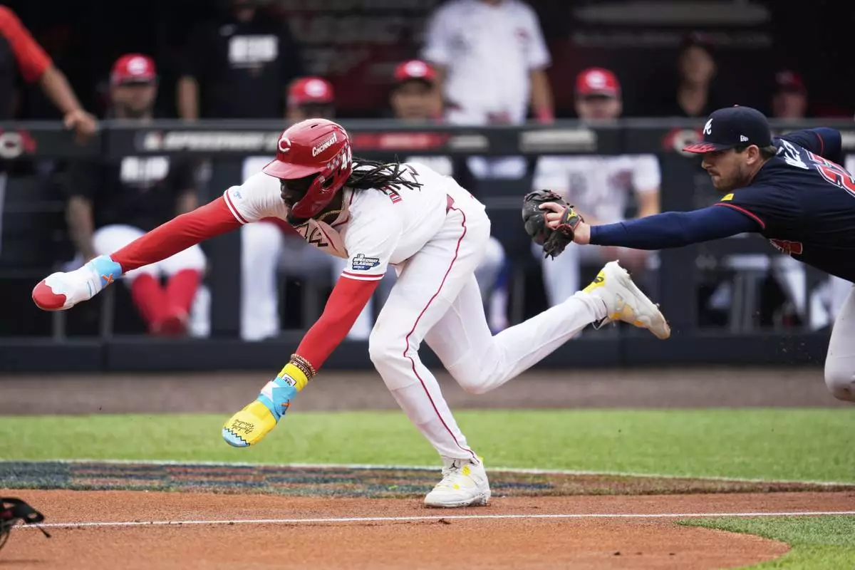 Cincinnati Reds' Elly De La Cruz is tagged out by Atlanta Braves third base Austin Riley during the first inning of the MLB Speedway Classic baseball game at Bristol Motor Speedway in Bristol, Tenn., Sunday, Aug. 3, 2025. Play was resumed today after yesterday's weather delay. (AP Photo/George Walker IV)