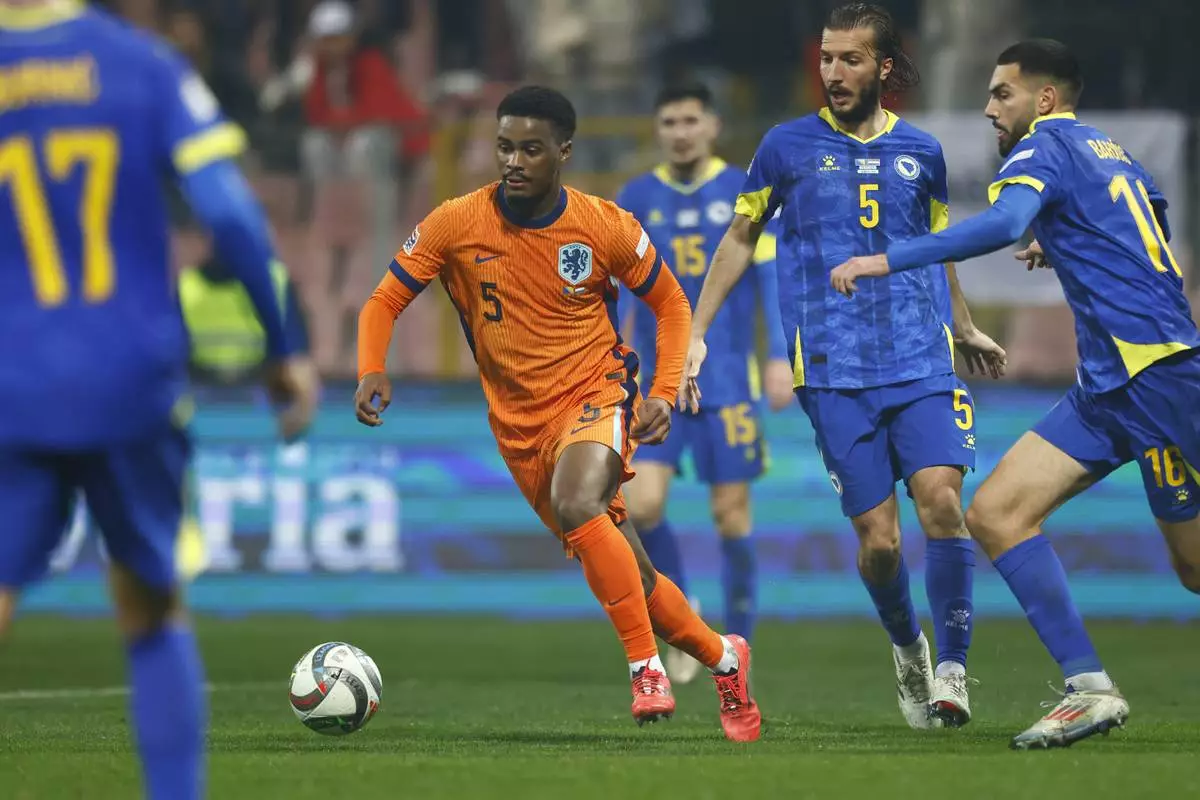 FILE - Jorrel Hato of the Netherlands, centre, is in action during the UEFA Nations League Group A3 soccer match between Bosnia-Herzegovina and the Netherlands at Bilino Polje stadium in Zenica, Bosnia, Tuesday, Nov. 19, 2024. (AP Photo/Armin Durgut, File)