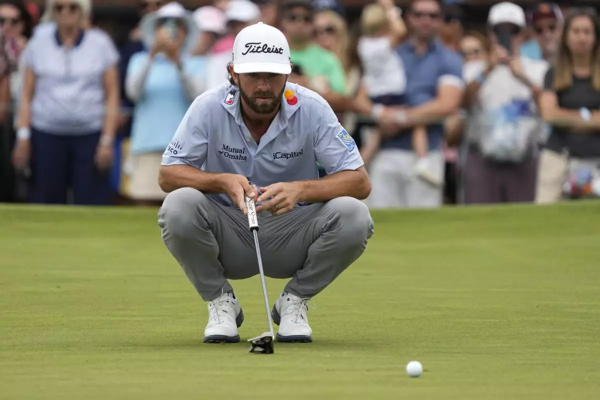 Cameron Young lines up his putt on the ninth hole during the final round of the Wyndham Championship golf tournament in Greensboro, N.C., Sunday, Aug. 3, 2025. (AP Photo/Chuck Burton)
