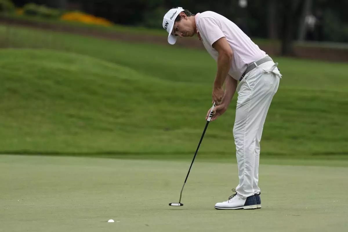 Nico Echavarria, of Colombia, sinks a birdie putt on the eighth hole during the final round of the Wyndham Championship golf tournament in Greensboro, N.C., Sunday, Aug. 3, 2025. (AP Photo/Chuck Burton)