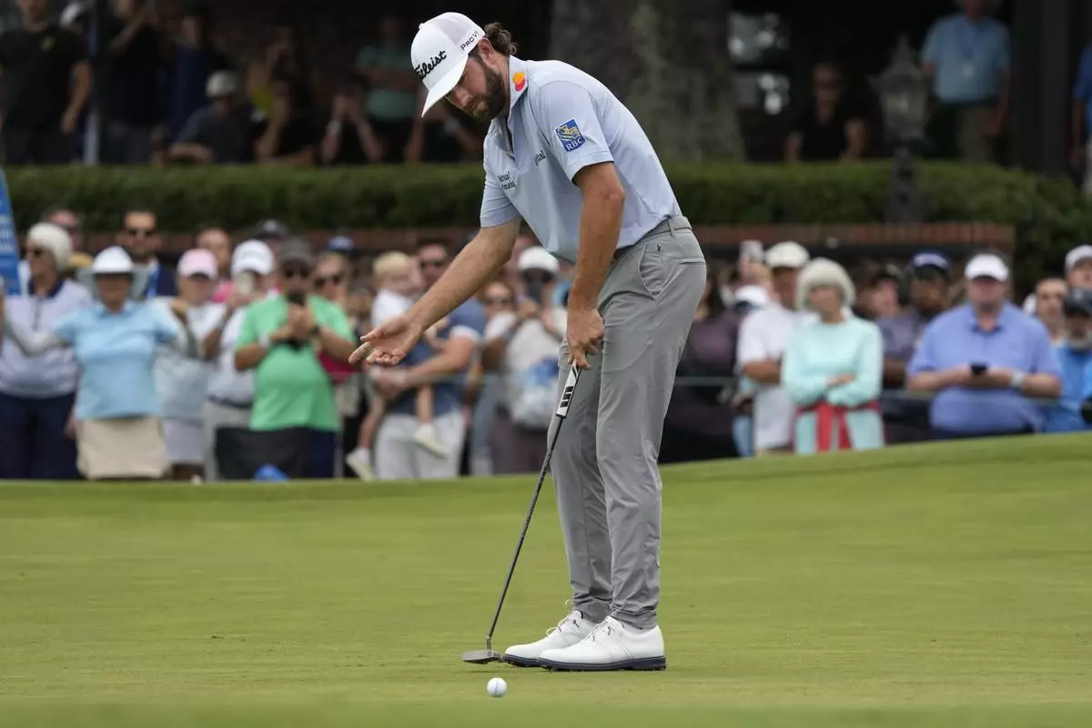 Cameron Young reacts to his putt on the ninth hole during the final round of the Wyndham Championship golf tournament in Greensboro, N.C., Sunday, Aug. 3, 2025. (AP Photo/Chuck Burton)