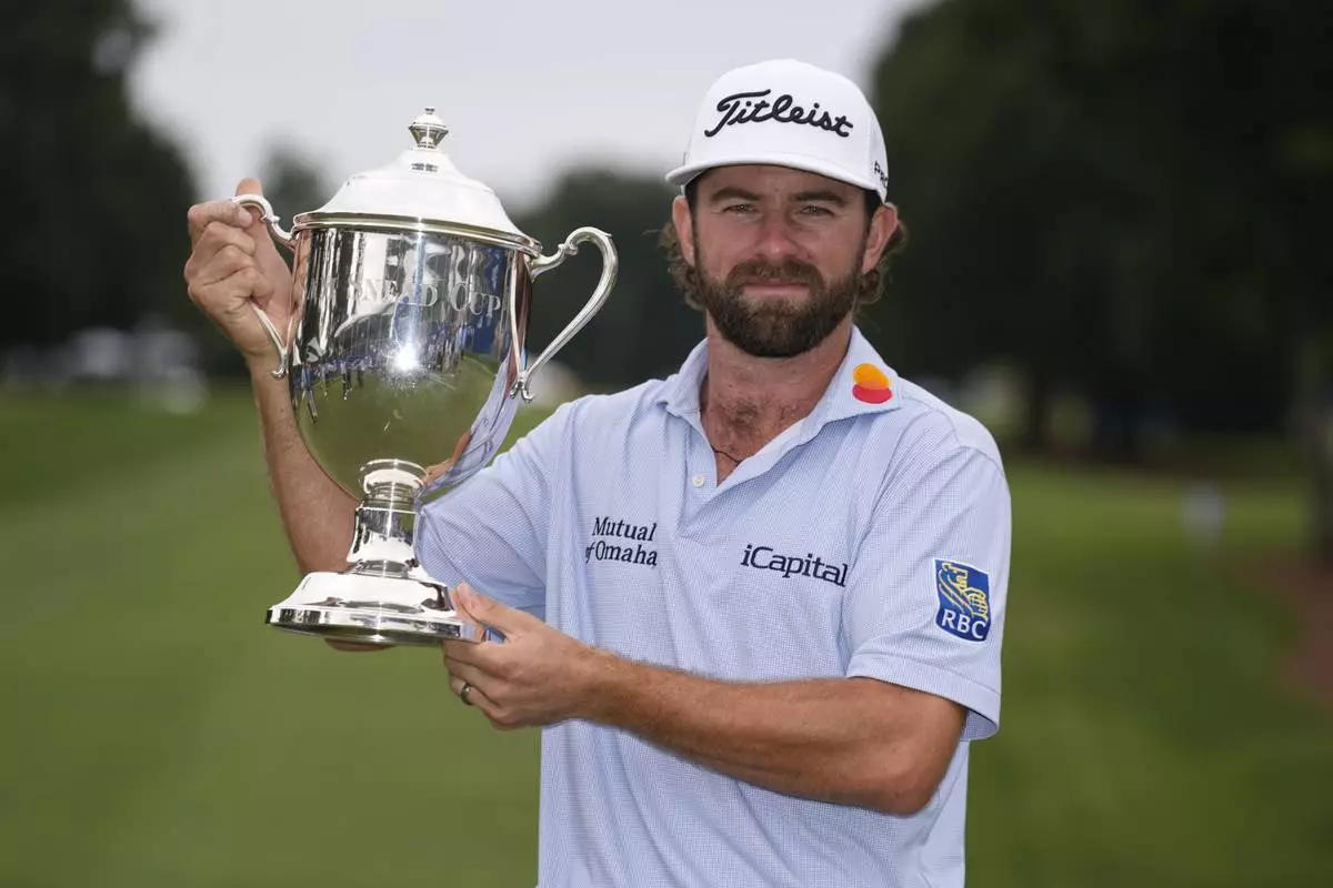Cameron Young poses with the trophy after winning the Wyndham Championship golf tournament in Greensboro, N.C., Sunday, Aug. 3, 2025. (AP Photo/Chuck Burton)