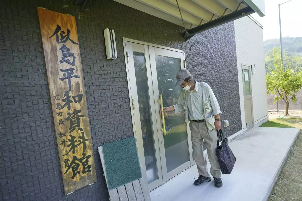 Kazuo Miyazaki, a local historian and head of the Ninoshima History Volunteer Guide Association, opens his peace information center on Tuesday, July 8, 2025, at Ninoshima in Hiroshima, western Japan. (AP Photo/Eugene Hoshiko)
