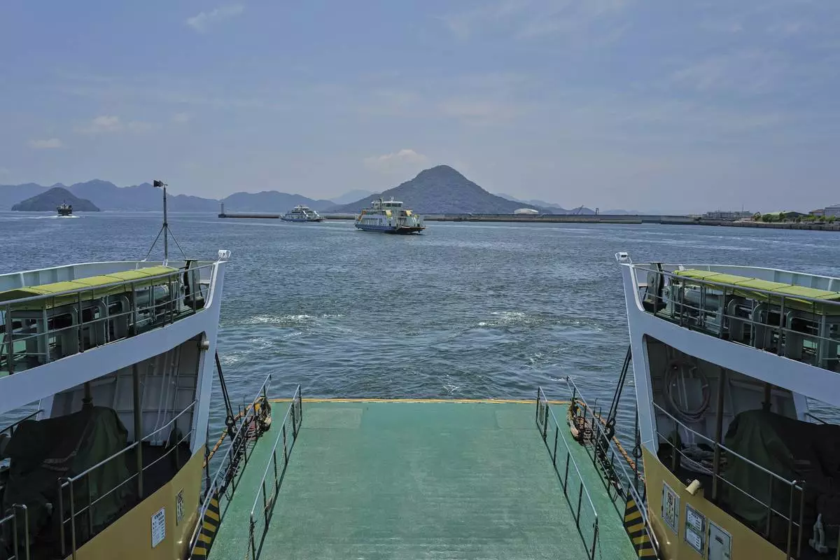 Ninoshima, an island where thousands of the dead and dying were brought after the first atomic bomb detonated 80 years ago, is seen from a ferry on Monday, July 7, 2025, in Hiroshima, western Japan. (AP Photo/Eugene Hoshiko)