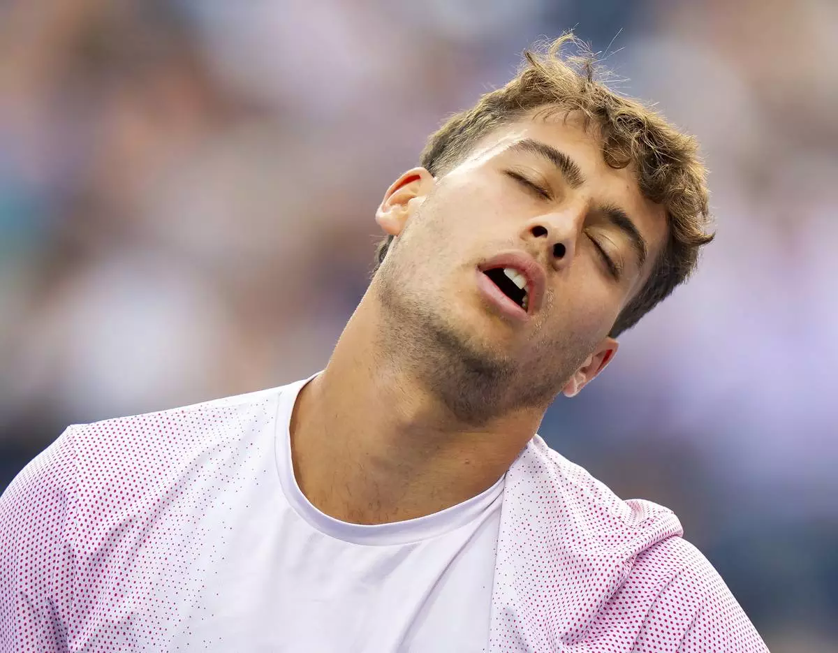 Flavio Cobolli, of Italy, reacts after getting broken by Ben Shelton, of the United States, during their match at the National Bank Open men's tennis tournament in Toronto, Sunday, Aug. 3, 2025. (Frank Gunn/The Canadian Press via AP)