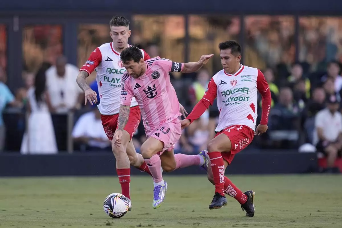 Inter Miami forward Lionel Messi, center, charges through Necaxa forward Raul Sanchez, left, and midfielder Jose Rodriguez, during the first half of a Leagues Cup soccer match, Saturday, Aug. 2, 2025, in Fort Lauderdale, Fla. (AP Photo/Rebecca Blackwell)