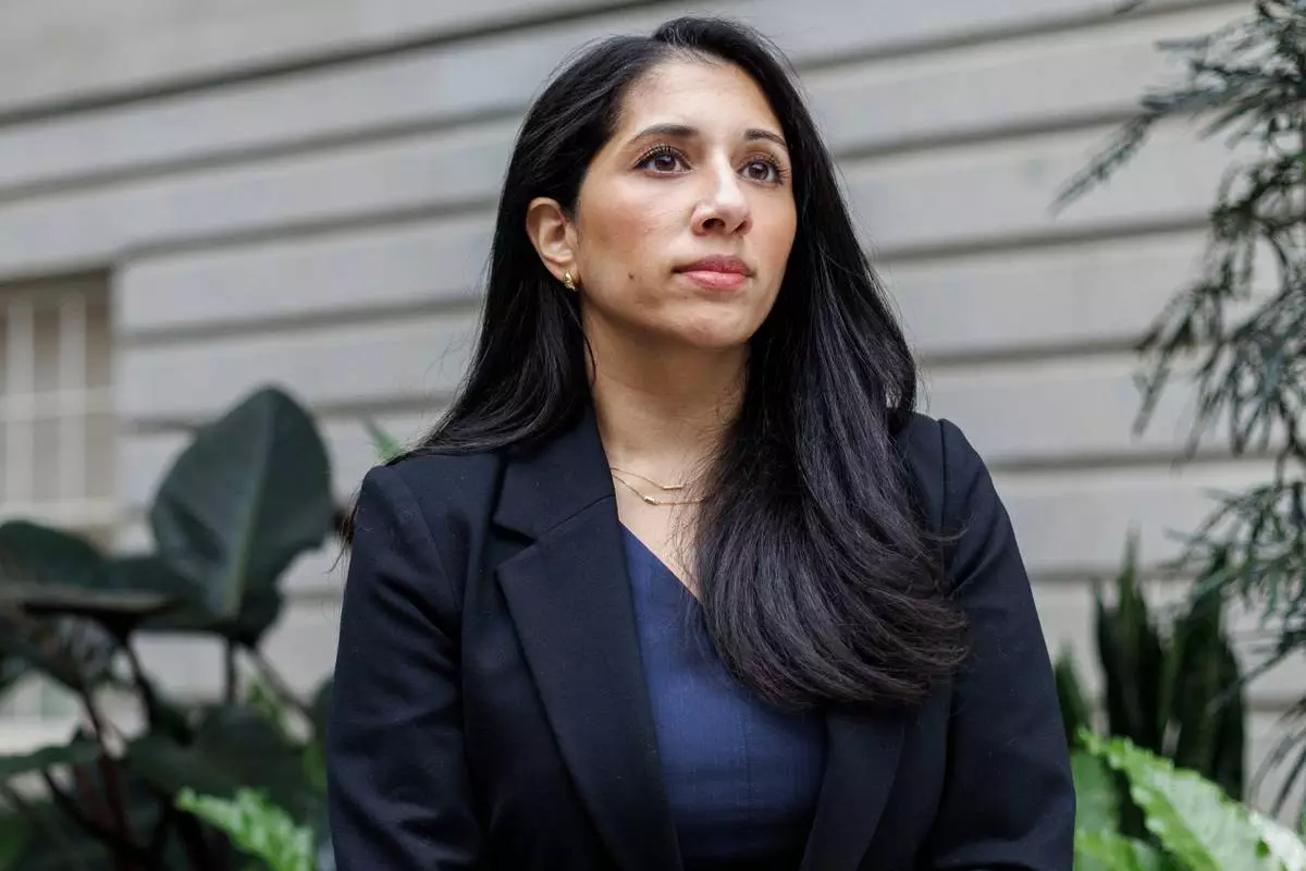 Anam Petit, a former Justice Department employee, poses for a portrait in the Robert and Arlene Kogod Courtyard at the National Portrait Gallery in Washington, Friday, Jan. 9, 2026. (AP Photo/Moriah Ratner)