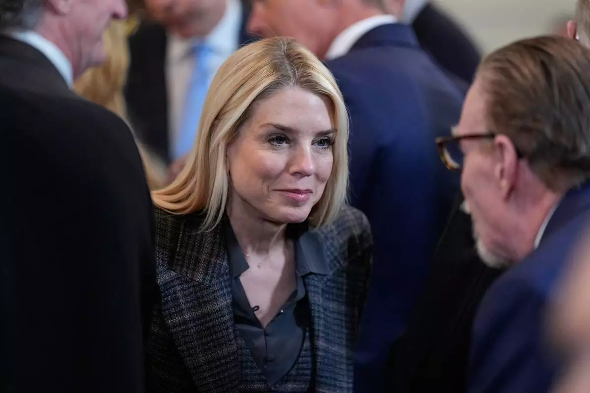 Attorney General Pam Bondi arrives before President Donald Trump speaks during an event to honor the 2025 Stanley Cup Champion Florida Panthers in the East Room of the White House, Thursday, Jan. 15, 2026, in Washington. (AP Photo/Alex Brandon)