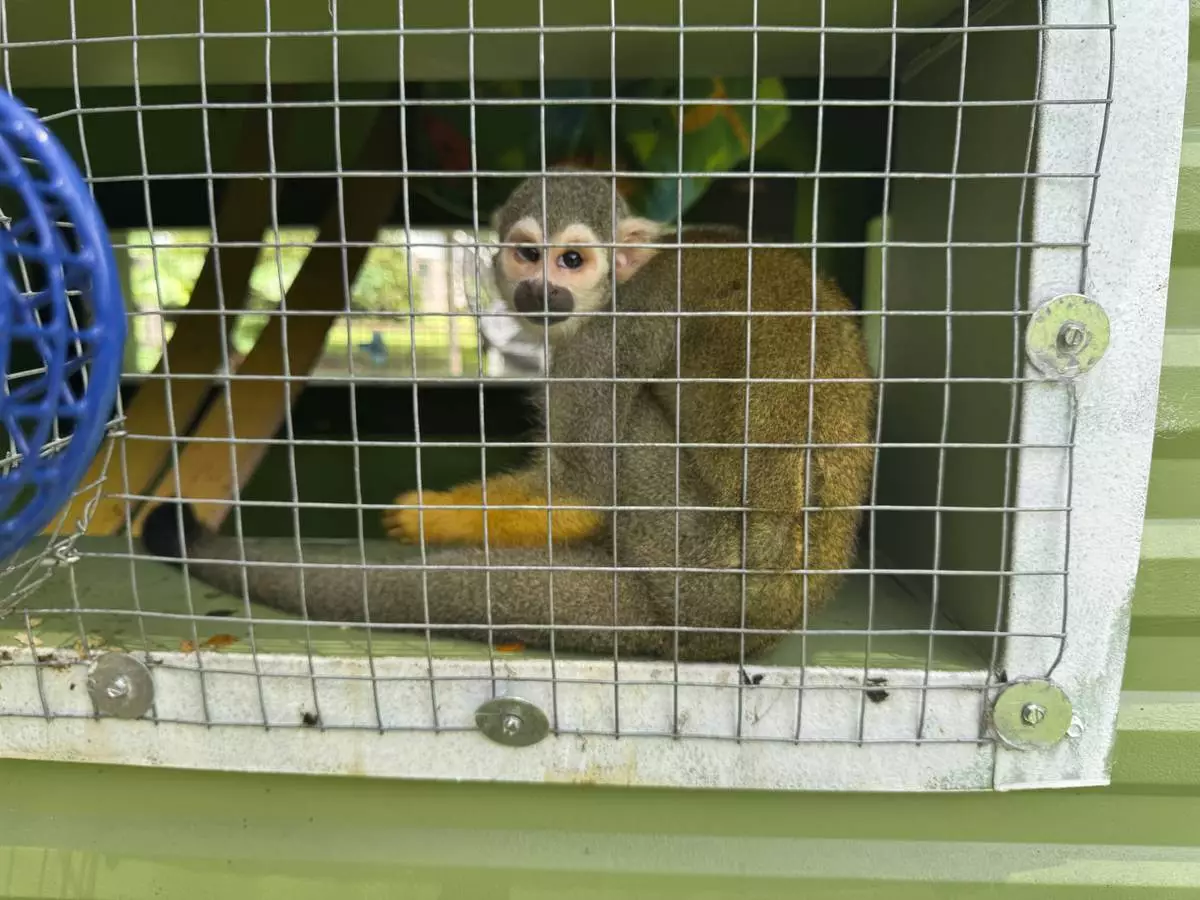 A squirrel monkey looks out from its enclosure at the Gulf Coast Primate Sanctuary in Perkinston, Mississippi on Friday, July 25, 2025. (AP Photo/Sophie Bates)