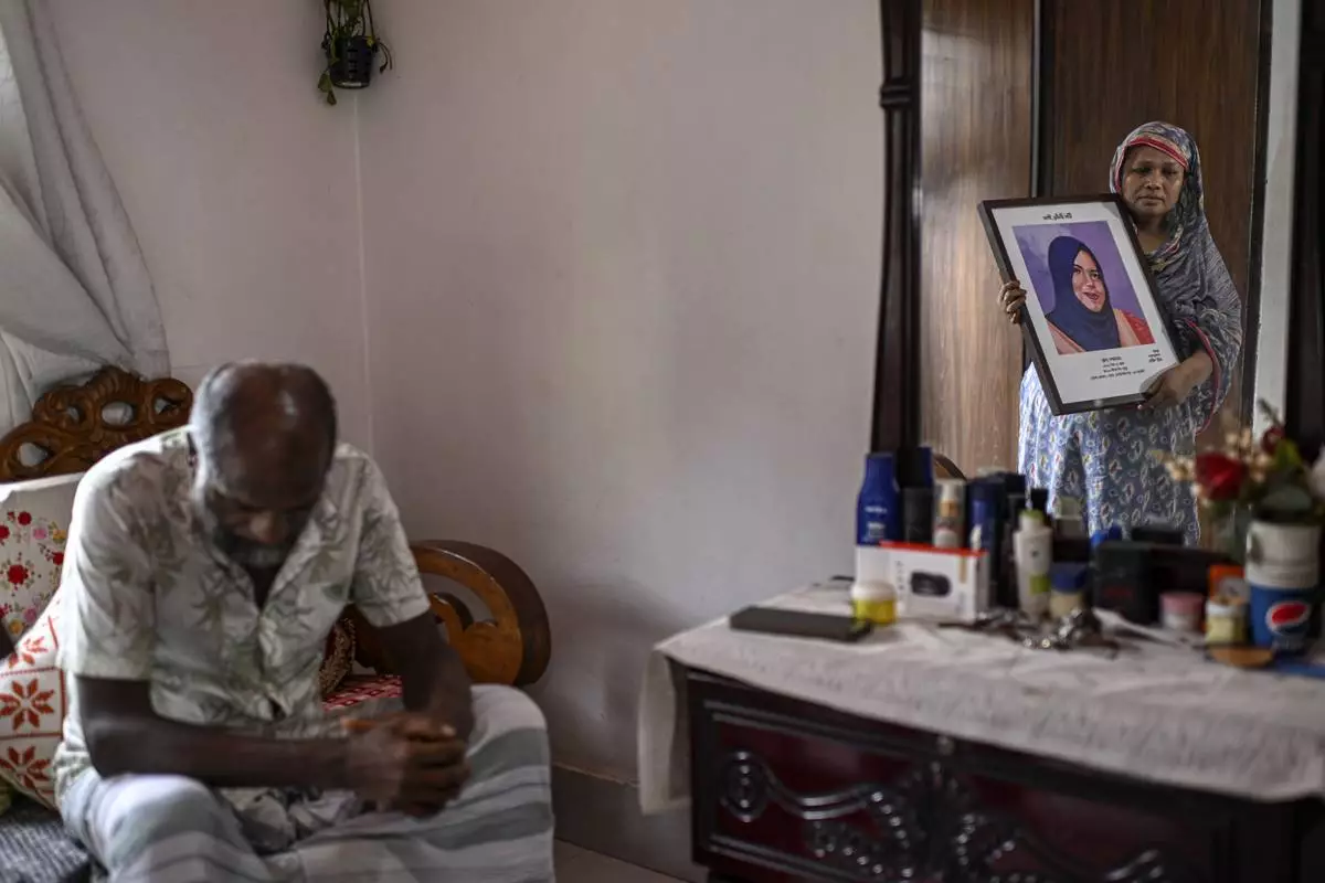 Asma Begum, standing next to her husband, is reflected in a mirror as she holds a portrait of her daughter Meherunnesa, who died by a stray bullet while standing near a window at her home, hours after former Prime Minister Sheikh Hasina fled the country amid a student-led mass uprising last year in Dhaka, Bangladesh, July 28, 2025. (AP Photo/Mahmud Hossain Opu)