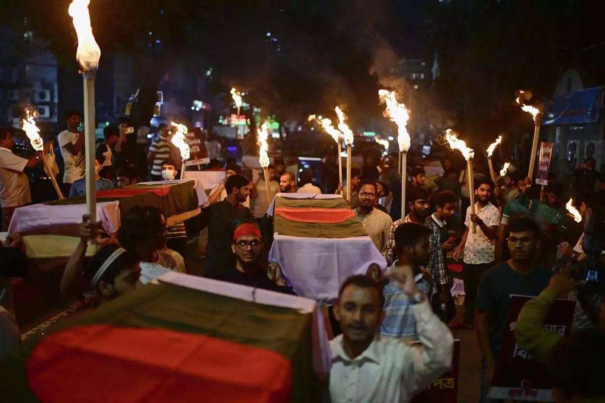 In this July 16, 2025 photo, activists carry symbolic coffins and torches during a procession to mark the day of a student-led protest one year ago, in Dhaka, Bangladesh. (AP Photo/Mahmud Hossain Opu)