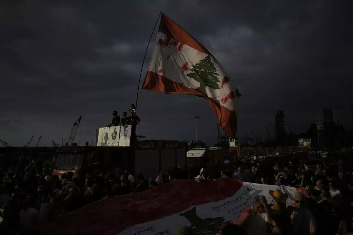 Relatives of victims of the deadly 2020 Beirut port explosion stand on the ladder of a firetruck, holding portraits of their loved ones and a giant Lebanese flag, during a gathering marking the fifth anniversary of the massive blast, outside the port of Beirut, Lebanon, Monday, Aug. 4, 2025. (AP Photo/Hassan Ammar)