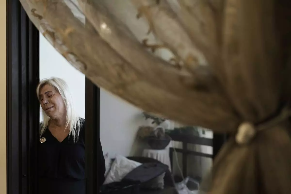 Chouchan Yeghiyan, mother of Jessica Bezdjian who was killed in the massive 2020 blast at Beirut's seaport, weeps during an interview with The Associated Press at her home in Bsalim, Lebanon, Saturday, Aug. 2, 2025. (AP Photo/Hassan Ammar)