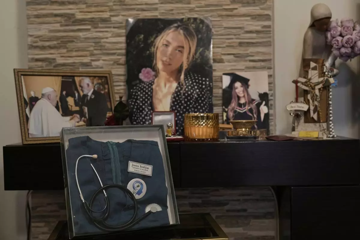 A display honoring Jessica Bezdjian, a nursing student who was killed in the massive 2020 blast at Beirut's seaport, shows her nursing uniform and personal items at her family's home in Bsalim, Lebanon, Saturday, Aug. 2, 2025. (AP Photo/Hassan Ammar)