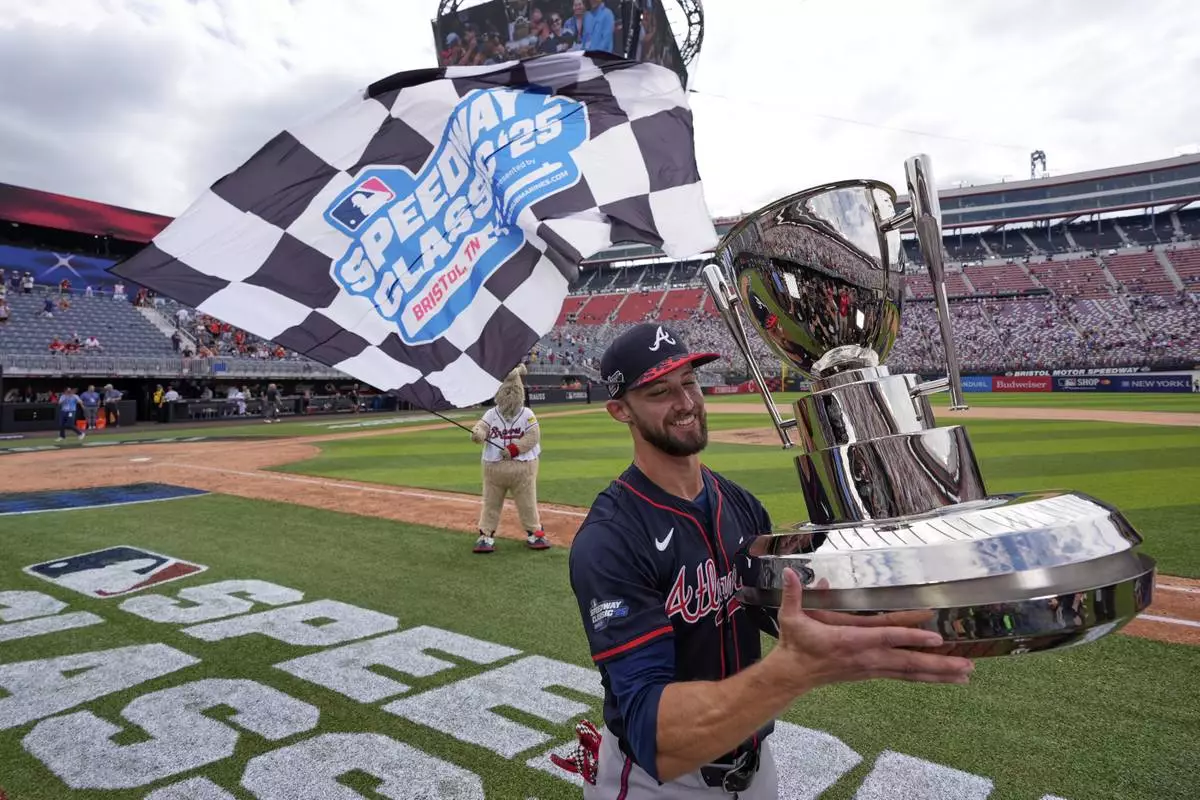 Atlanta Braves outfielder Eli White holds the trophy after their win against the Cincinnati Reds I the MLB Speedway Classic baseball game at Bristol Motor Speedway in Bristol, Tenn., Sunday, Aug. 3, 2025. Play was resumed today after yesterday's weather delay. (AP Photo/George Walker IV)