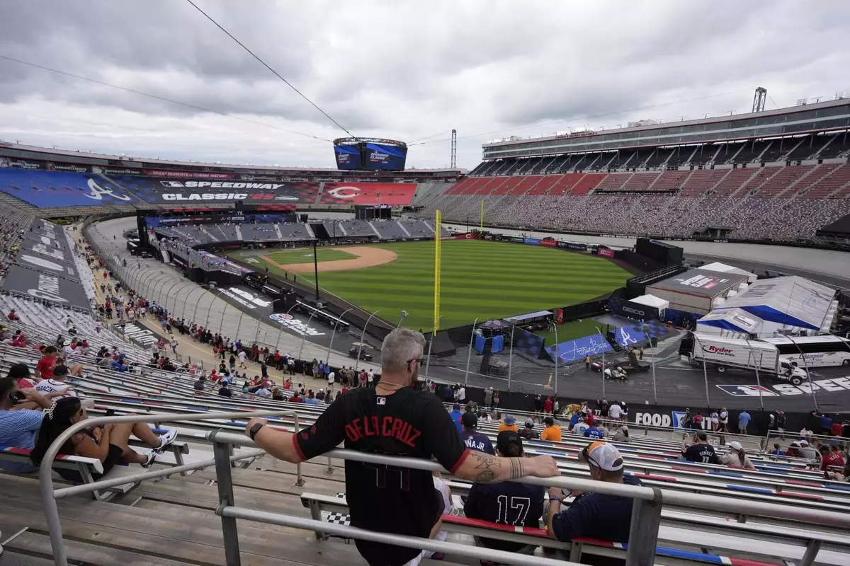 Fans gather for the MLB Speedway Classic baseball game at Bristol Motor Speedway in Bristol, Tenn., Sunday, Aug. 3, 2025. Play was resumed today after yesterday's weather delay. (AP Photo/George Walker IV)