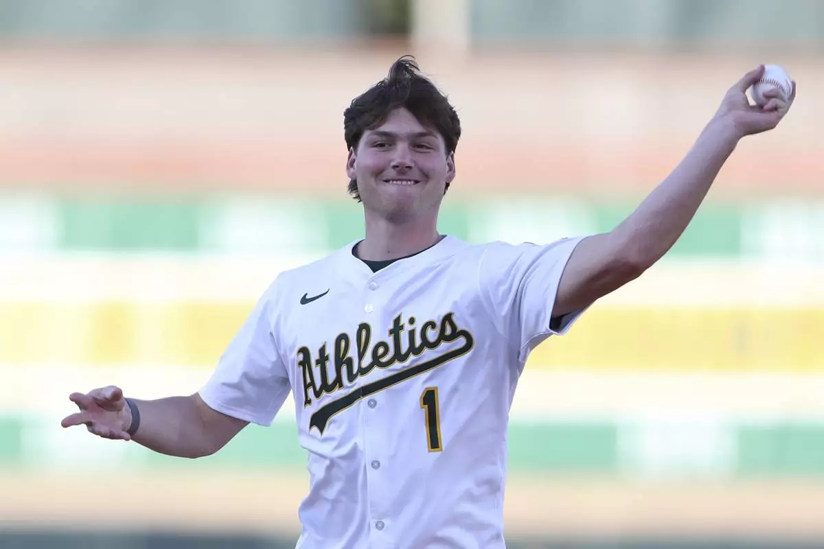 Athletics' 2025 first-round pick Jamie Arnold throws out a ceremonial first pitch before a baseball game against the Seattle Mariners, Monday, July 28, 2025, in West Sacramento, Calif. (AP Photo/Scott Marshall)