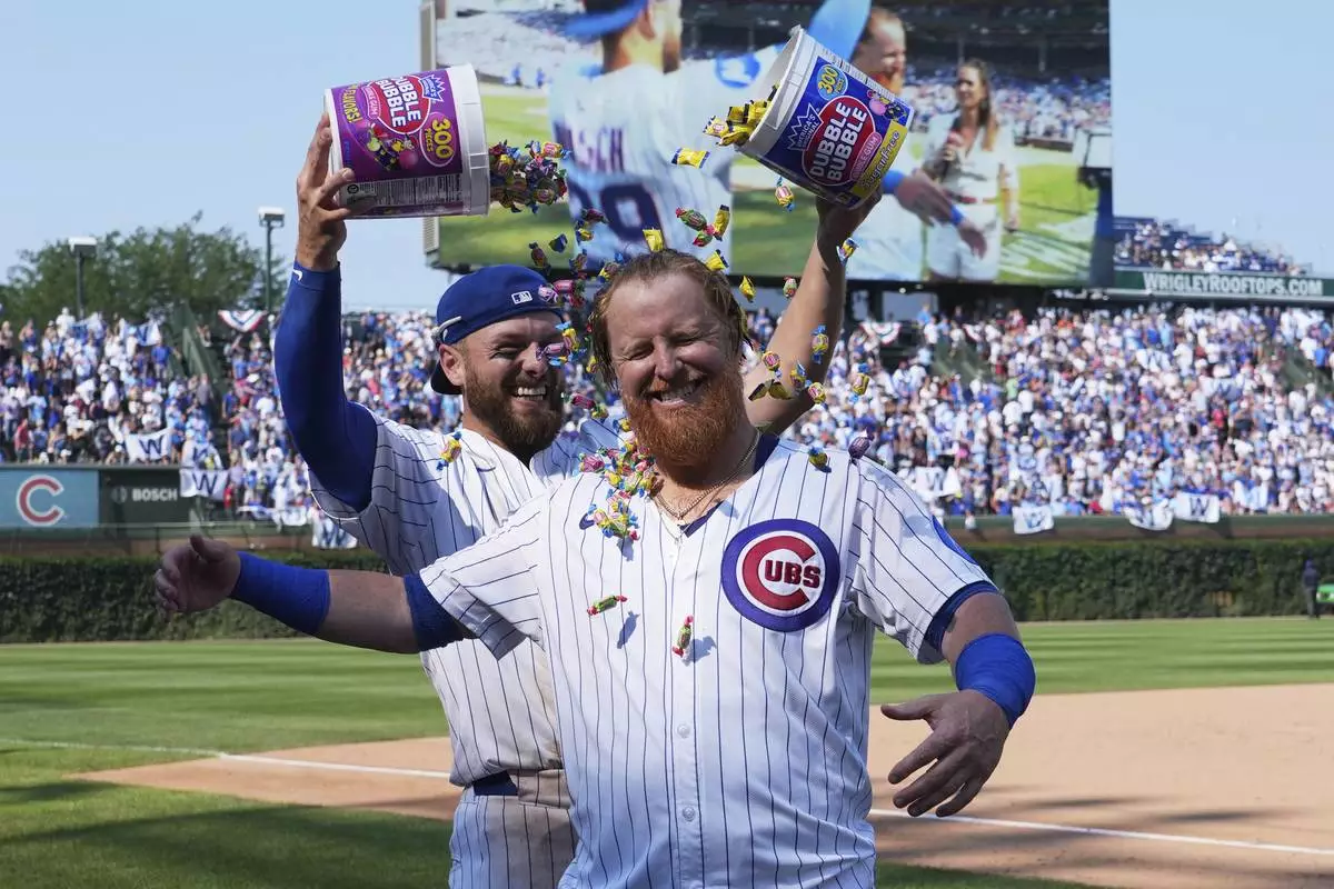 Chicago Cubs' Justin Turner, right, celebrates with Michael Busch, left, after hitting the winning two-run home run during the ninth inning of a baseball game against the Baltimore Orioles in Chicago, Sunday, Aug. 3, 2025. (AP Photo/Nam Y. Huh)