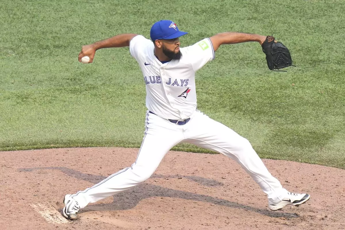 Toronto Blue Jays pitcher Seranthony Domínguez works against the Kansas City Royals during first-inning baseball game action in Toronto, Sunday Aug. 3, 2025. (Chris Young/The Canadian Press via AP)