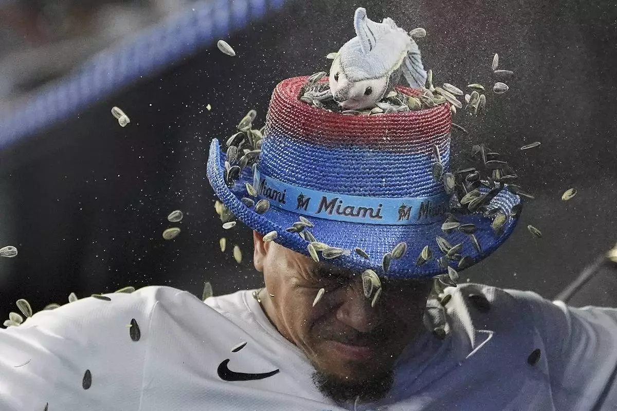 Miami Marlins' Heriberto Hernandez is doused with sunflower seeds in the dugout after hitting a home run in the third inning of a baseball game against the Houston Astros, Wednesday, Aug. 6, 2025, in Miami. (AP Photo/Rebecca Blackwell)