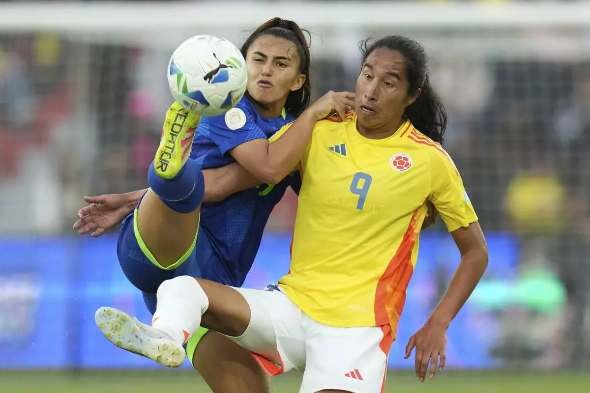 Brazil's Mariza, left, and Colombia's Mayra Ramirez battle for the ball during the Women's Copa America final soccer match at Rodrigo Paz Delgado stadium in Quito, Ecuador, Saturday, Aug. 2, 2025. (AP Photo/Dolores Ochoa)