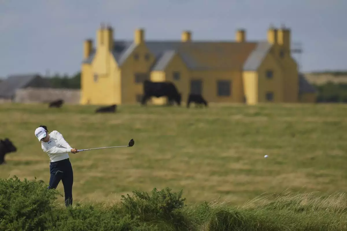 Minami Katsu of Japan plays a shot from the 6th tee during the final round of the Women's British Open golf championship, at Royal Porthcawl Golf Club in Porthcawl, Wales, Sunday, Aug. 3, 2025. (AP Photo/Kin Cheung)
