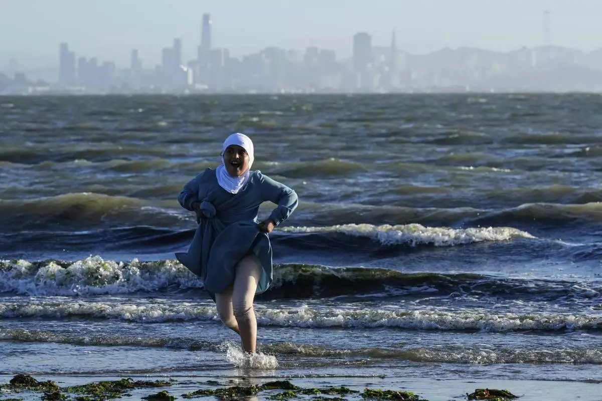 A girl plays on the shore at Albany Beach as the San Francisco skyline is seen in the background Wednesday, Aug. 6, 2025, in Albany, Calif. (AP Photo/Godofredo A. Vásquez)