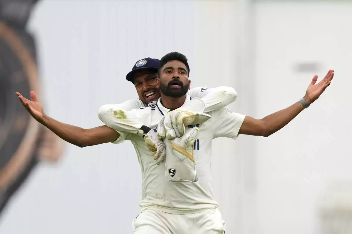 India's Mohammed Siraj and India's Dhruv Jurel celebrate their win against England on day five of the fifth cricket test match between England and India at The Kia Oval in London, Monday, Aug. 4, 2025. (AP Photo/Kirsty Wigglesworth)