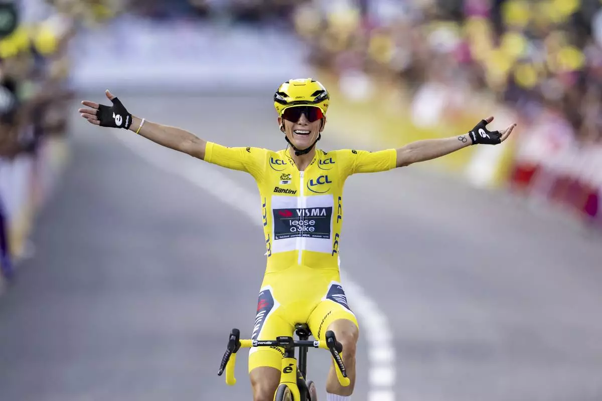 The winner of the Tour de France Femmes Pauline Ferrand-Prevot from France of team Visma - Lease a Bike celebrates as she crosses the finish line to win the 9th stage of the 4th edition of the Women's Tour de France cycling race, 124,1 km from Praz-Sur-Arly to Chatel Les Portes du Soleil, in Chatel, France, Sunday Aug. 3, 2025. (Jean-Christophe Bott/Keystone via AP)