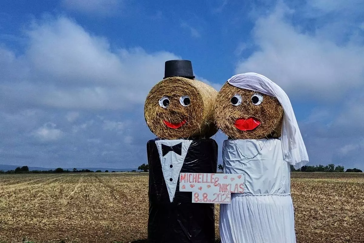 Straw bales are decorated as a wedding couple to point out an upcoming wedding in the outskirts of Frankfurt, Germany, Monday, Aug. 4, 2025. (AP Photo/Michael Probst)