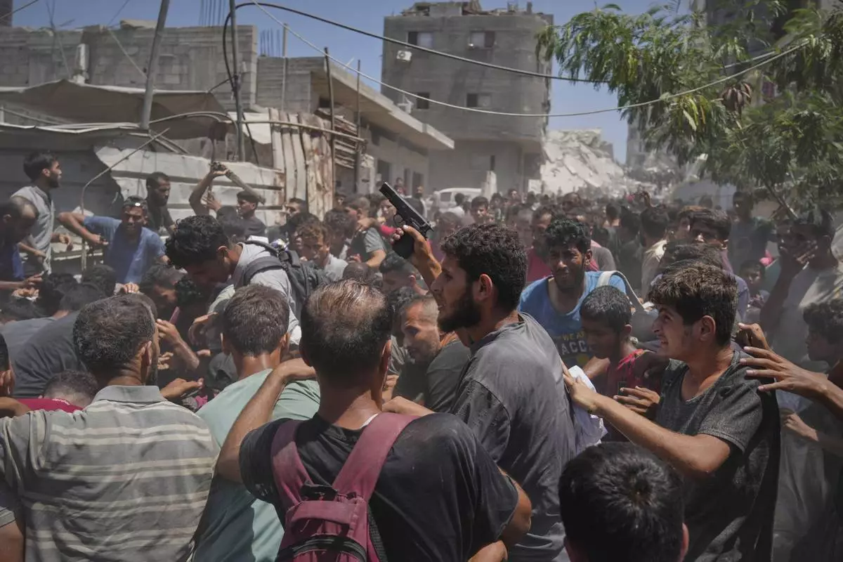 A Palestinian man wave a pistol as others struggle to collect humanitarian aid airdropped by parachutes into Gaza City, northern Gaza Strip, Thursday, Aug. 7, 2025. (AP Photo/Jehad Alshrafi)