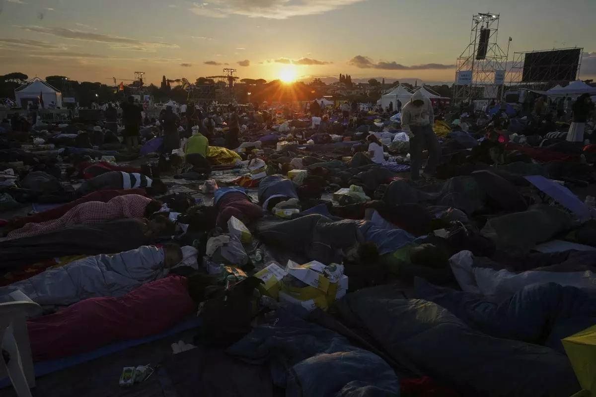 Young people wake up after spending the night at the Tor Vergata field in Rome as they participate in the Youths Jubilee, Sunday, Aug. 3, 2025. (AP Photo/Andrew Medichini)
