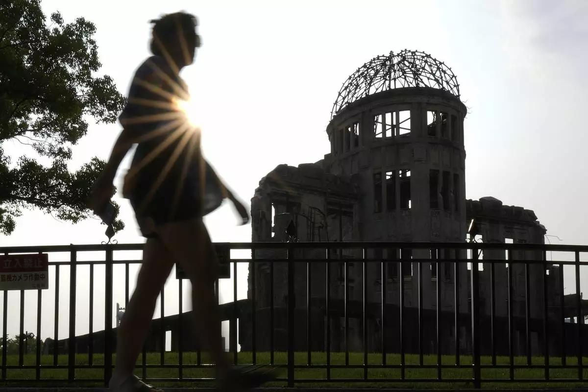 A foreign visitor walks by the iconic exhibition hall best known as the Atomic Bomb Dome on Wednesday, July 9, 2025, in Hiroshima, western Japan. (AP Photo/Eugene Hoshiko)