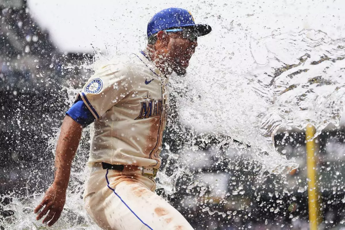 Seattle Mariners' Julio Rodriguez reacts while being doused by teammate Victor Robles to celebrate a win over the Texas Rangers in a baseball game Sunday, Aug. 3, 2025, in Seattle. (AP Photo/Lindsey Wasson)