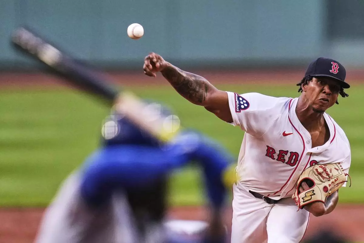 Boston Red Sox pitcher Brayan Bello delivers during the first inning of a baseball game against the Kansas City Royals at Fenway Park, Monday, Aug. 4, 2025, in Boston. (AP Photo/Charles Krupa)