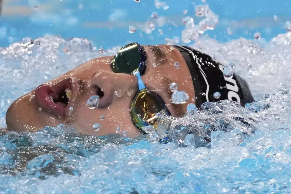 Leon Marchand of France competes in the men's 400-meter individual medley heats at the World Aquatics Championships in Singapore, Sunday, Aug. 3, 2025. (AP Photo/Lee Jin-man)