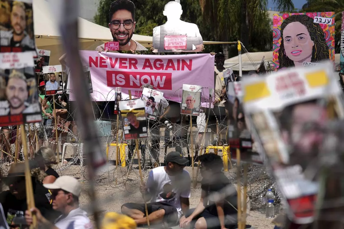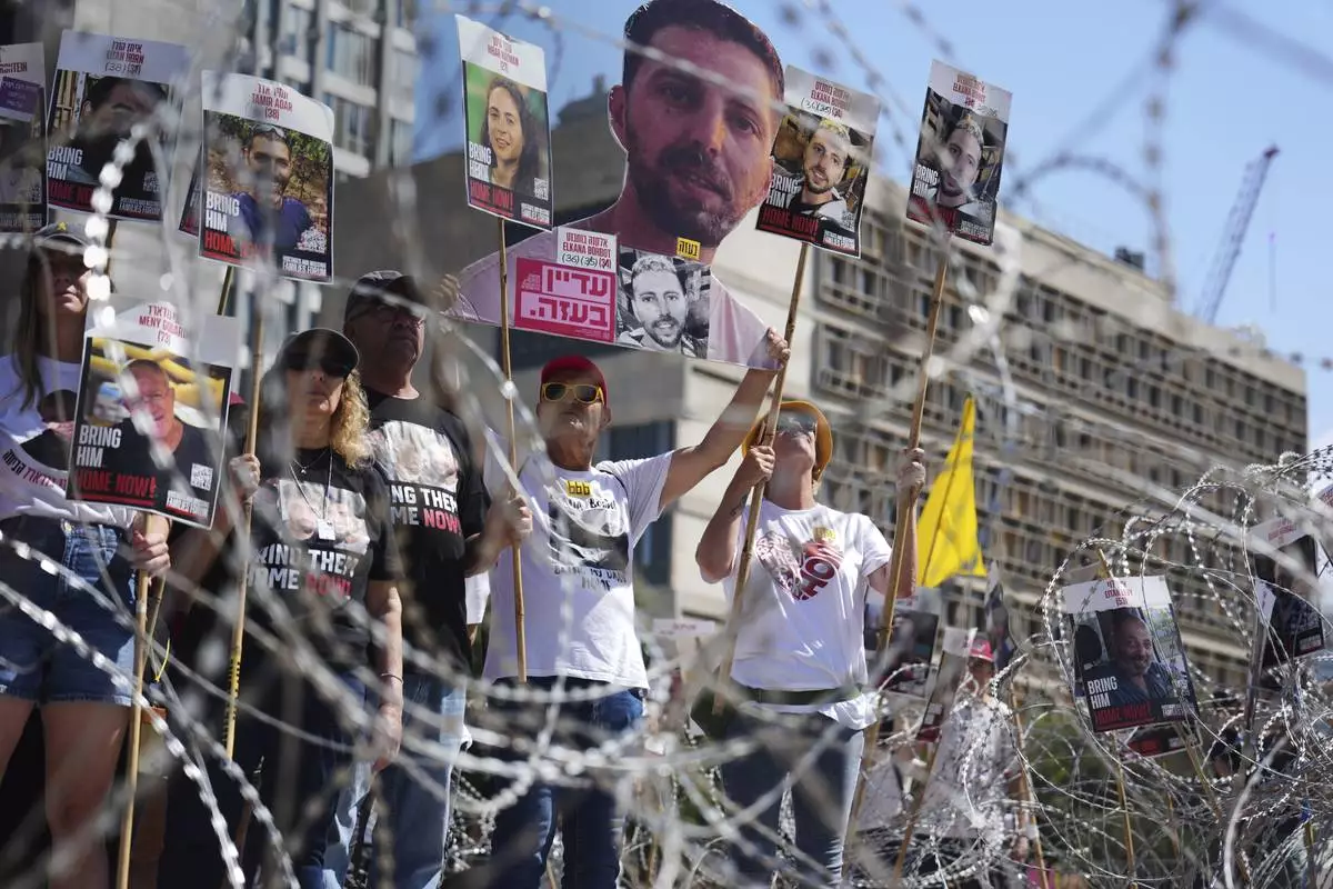 Families of hostages protest, demanding the release from Hamas captivity in the Gaza Strip, at the plaza known as the hostages square in Tel Aviv, Israel, Saturday, Aug. 2, 2025. (AP Photo/Ariel Schalit)