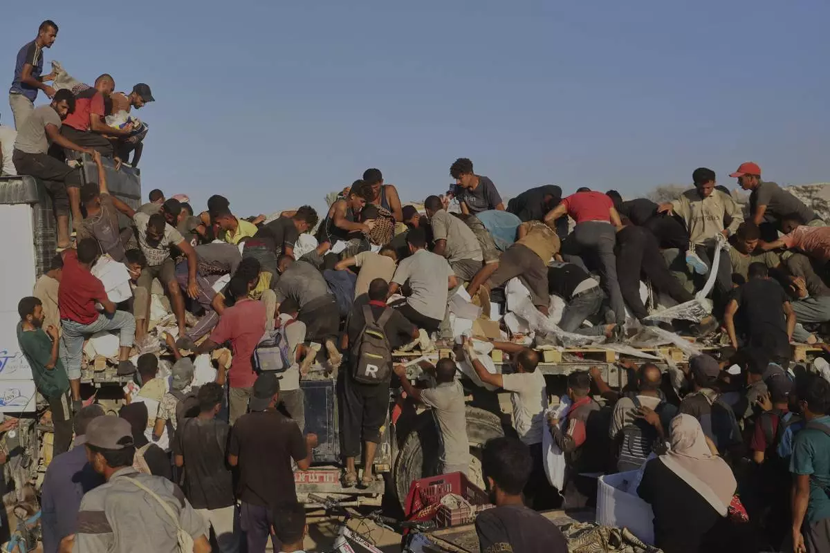 Palestinians struggle to get food and humanitarian aid from the back of a truck as it moves along the Morag corridor near Rafah, in the southern Gaza Strip, Monday, Aug. 4, 2025. (AP Photo/Mariam Dagga)