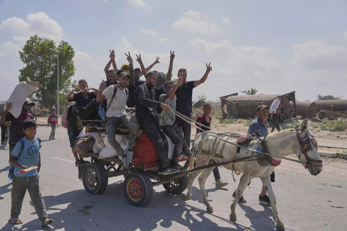 Palestinians wave to the camera as they carry humanitarian aid packages near a Gaza Humanitarian Foundation distribution center operated by the U.S.-backed organization, in Netzarim, central Gaza Strip, Monday, Aug. 4, 2025. (AP Photo/Abdel Kareem Hana)