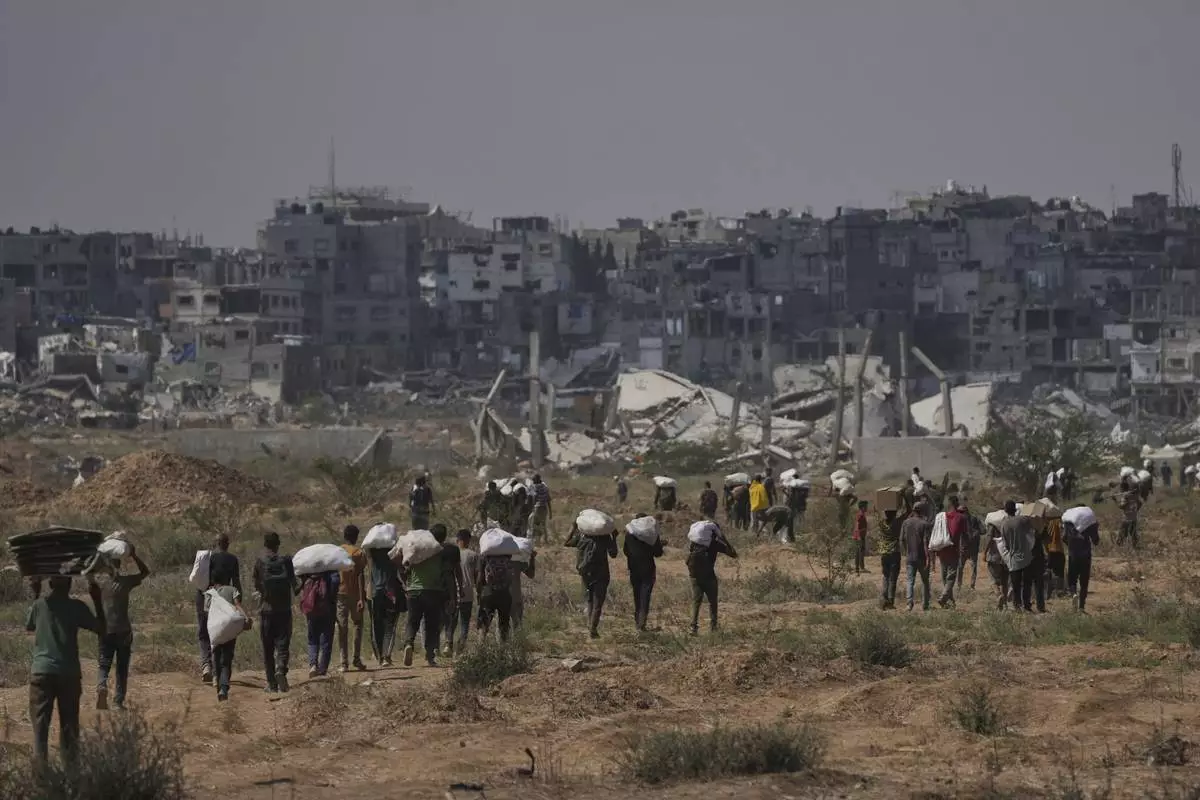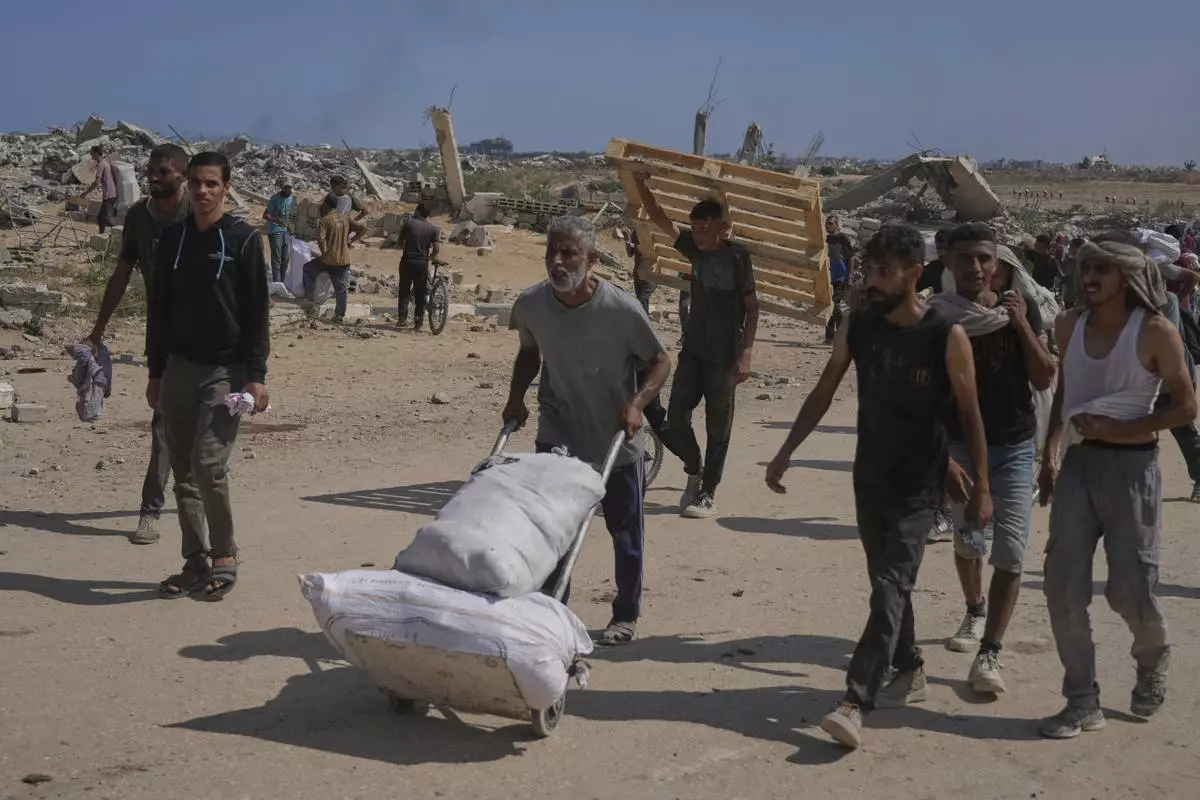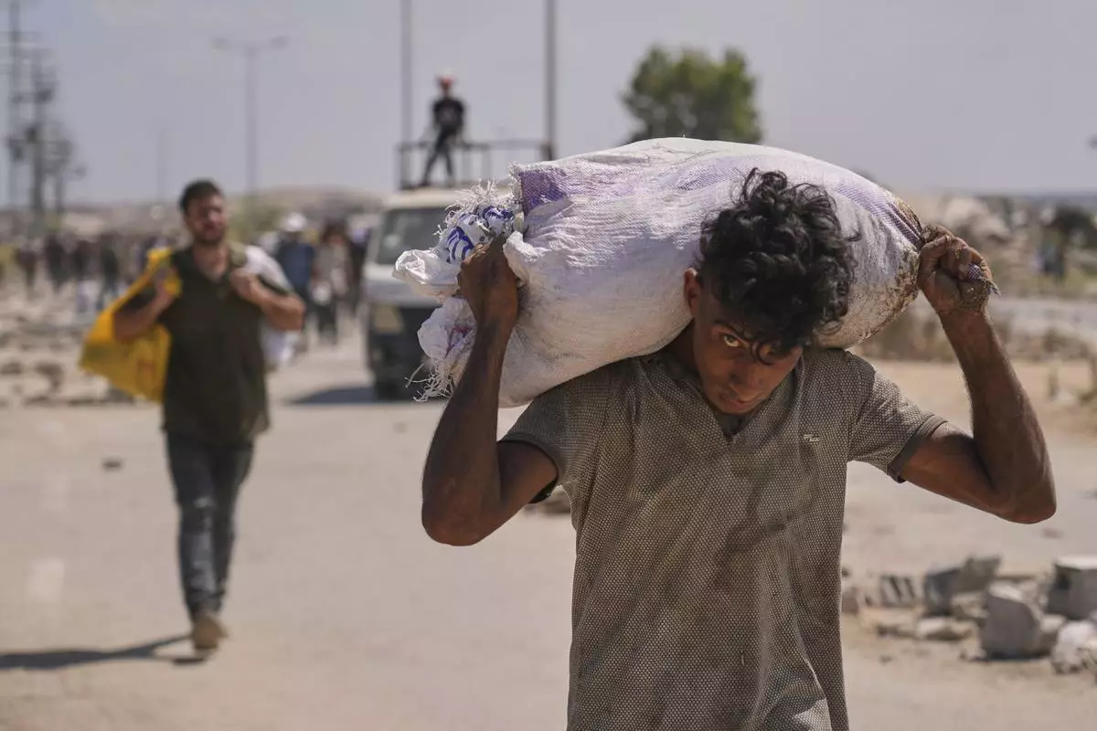 Palestinians carry packages of food taken from a humanitarian aid convoy that moved along the Morag corridor near Rafah, in the southern Gaza Strip, Monday, Aug. 4, 2025. (AP Photo/Mariam Dagga)