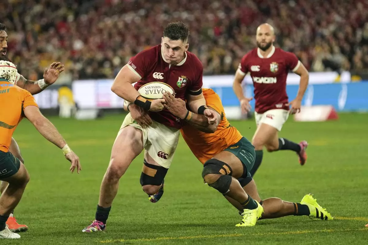 Dan Sheehan of the British & Irish Lions, center, goes on the charge during the second rugby union test against Australia at the Melbourne Cricket Ground in Melbourne, Australia, Saturday, July 26, 2025. (AP Photo/Rick Rycroft)