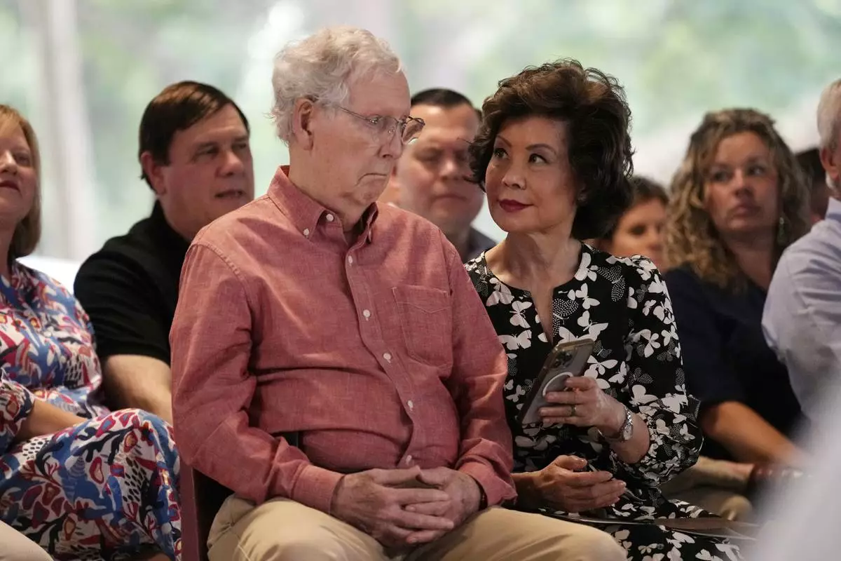 Sen. Mitch McConnell, R-Ky., looks at a phone held by his wife, Elaine Chao, at the annual Fancy Farm picnic Saturday, Aug. 2, 2025, in Fancy Farm, Ky. (AP Photo/Mark Humphrey)