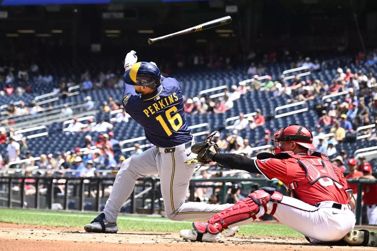 Milwaukee Brewers' Blake Perkins (16) loses his bat during his at bat in the first inning of a baseball game next to Washington Nationals catcher Drew Millas, right, Sunday, Aug. 3, 2025, in Washington. (AP Photo/Nick Wass)
