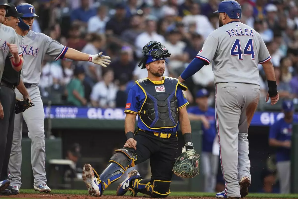 Seattle Mariners catcher Cal Raleigh looks on as Texas Rangers' Rowdy Tellez (44) greets teammate Corey Seager after scoring on a single by Josh Smith during the third inning of a baseball game Friday, Aug. 1, 2025, in Seattle. (AP Photo/Lindsey Wasson)