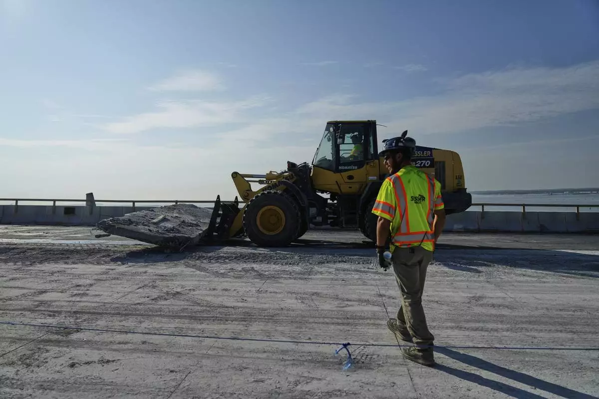 A slab of concrete is prepared to be removed from the remaining portions of the Francis Scott Key Bridge, Wednesday, July 30, 2025, in Baltimore. (AP Photo/Stephanie Scarbrough)