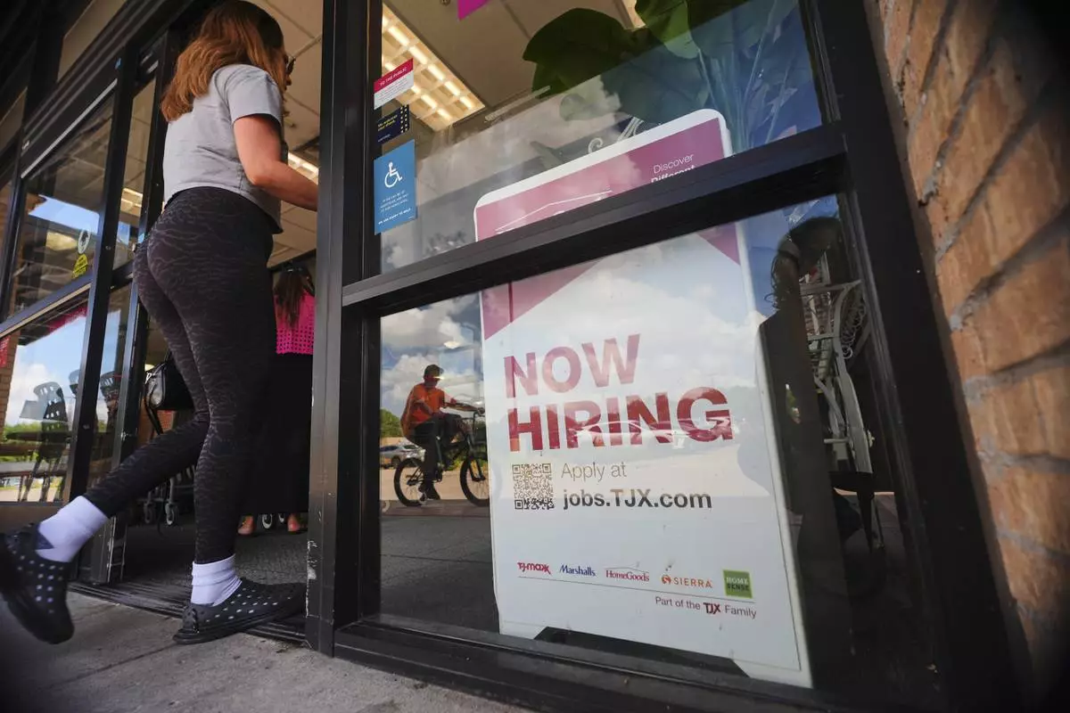FILE- A sign announces hiring, July 15, 2025, in Richardson, Texas. (AP Photo/LM Otero, File)
