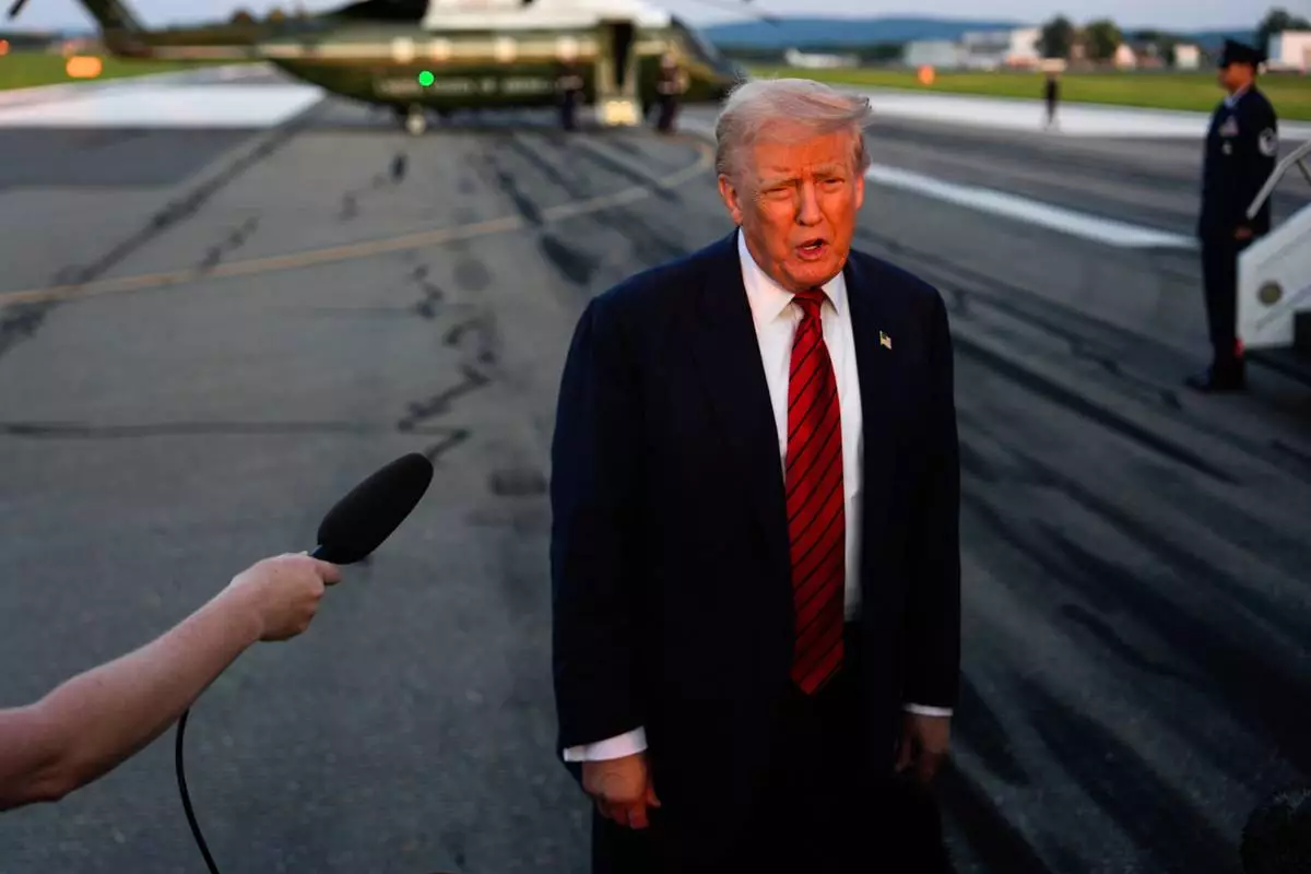President Donald Trump speaks with reporters before boarding Air Force One at Lehigh Valley International Airport, Sunday, Aug. 3, 2025, in Allentown, Pa. (AP Photo/Julia Demaree Nikhinson)